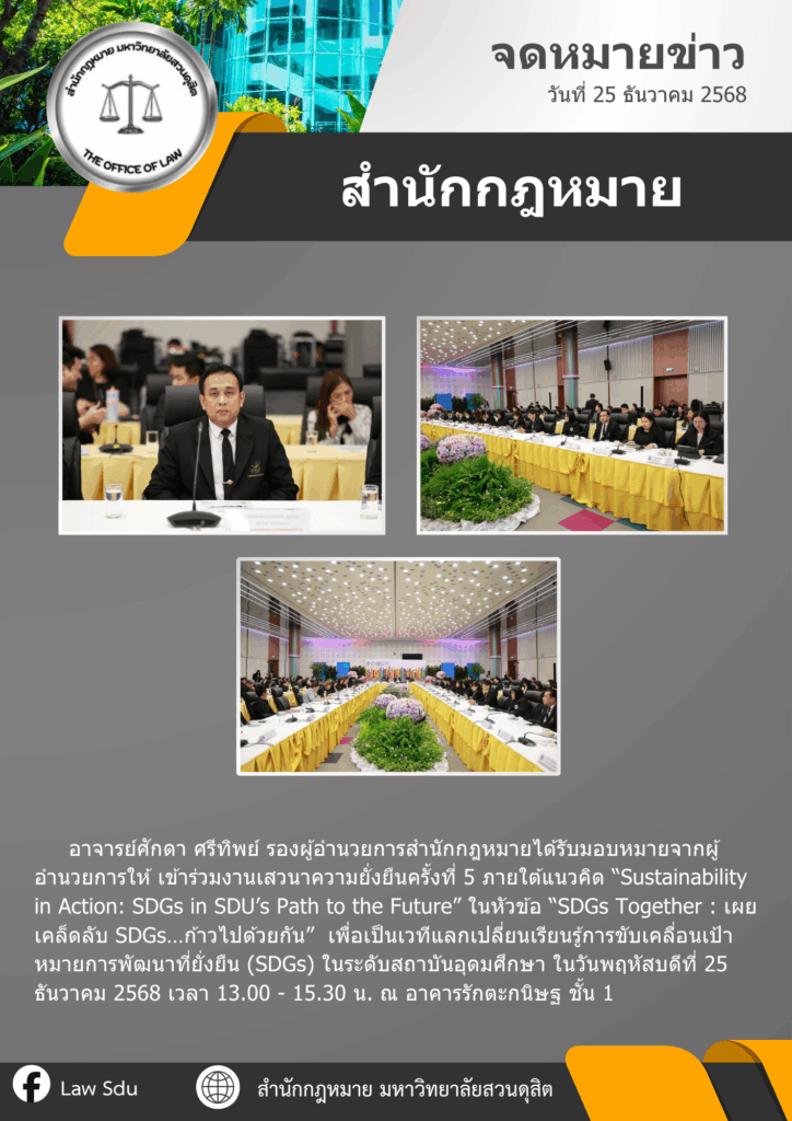 อาจารย์ศักดา ศรีทิพย์ รองผู้อำนวยการสำนักกฎหมายได้รับมอบหมายจากผู้อำนวยการให้ เข้าร่วมงานเสวนาความยั่งยืนครั้งที่ 5 ภายใต้แนวคิด “Sustainability in Action: SDGs in SDU’s Path to the Future” ในหัวข้อ “SDGs Together : เผยเคล็ดลับ SDGs…ก้าวไปด้วยกัน” เพื่อเป็นเวทีแลกเปลี่ยนเรียนรู้การขับเคลื่อนเป้าหมายการพัฒนาที่ยั่งยืน (SDGs) ในระดับสถาบันอุดมศึกษา ในวันพฤหัสบดีที่ 25 ธันวาคม 2568 เวลา 13.00 – 15.30 น. ณ อาคารรักตะกนิษฐ ชั้น 1