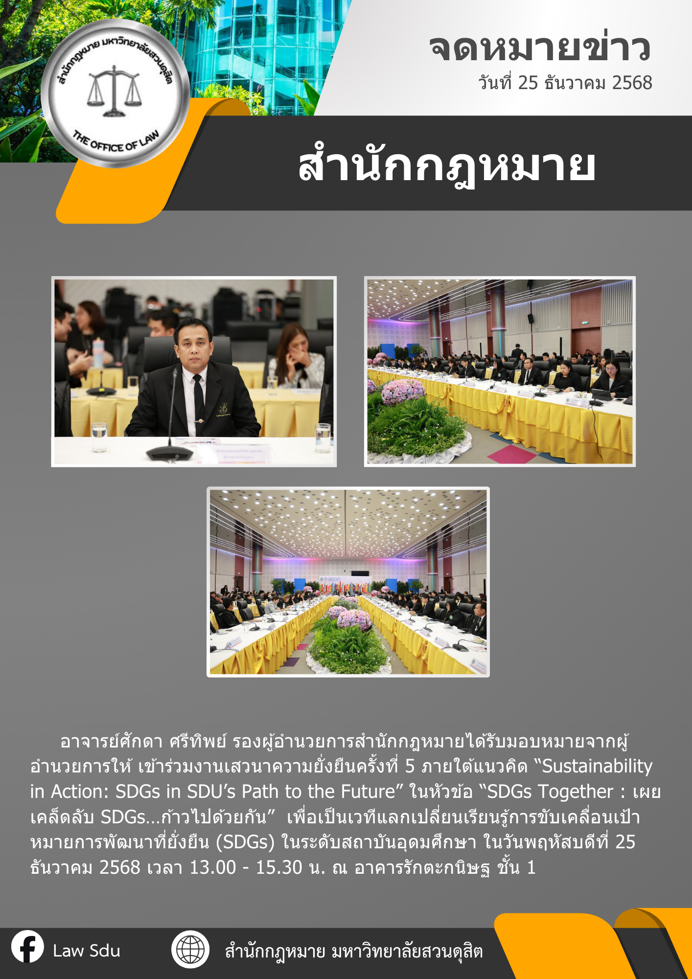 อาจารย์ศักดา ศรีทิพย์ รองผู้อำนวยการสำนักกฎหมายได้รับมอบหมายจากผู้อำนวยการให้ เข้าร่วมงานเสวนาความยั่งยืนครั้งที่ 5 ภายใต้แนวคิด “Sustainability in Action: SDGs in SDU’s Path to the Future” ในหัวข้อ “SDGs Together : เผยเคล็ดลับ SDGs…ก้าวไปด้วยกัน” เพื่อเป็นเวทีแลกเปลี่ยนเรียนรู้การขับเคลื่อนเป้าหมายการพัฒนาที่ยั่งยืน (SDGs) ในระดับสถาบันอุดมศึกษา ในวันพฤหัสบดีที่ 25 ธันวาคม 2568 เวลา 13.00 – 15.30 น. ณ อาคารรักตะกนิษฐ ชั้น 1
