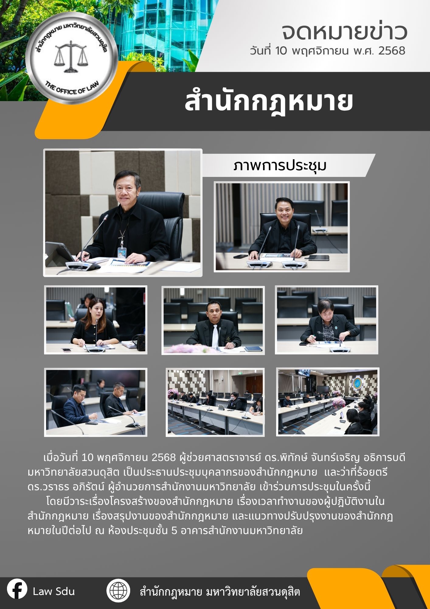 เมื่อวันที่ 10 พฤศจิกายน 2568 ผู้ช่วยศาสตราจารย์ ดร.พิทักษ์ จันทร์เจริญ อธิการบดีมหาวิทยาลัยสวนดุสิต เป็นประธานประชุมบุคลากรของสำนักกฎหมาย และว่าที่ร้อยตรี ดร.วราธร อภิรัตน์ ผู้อำนวยการสำนักงานมหาวิทยาลัย เข้าร่วมการประชุมในครั้งนี้