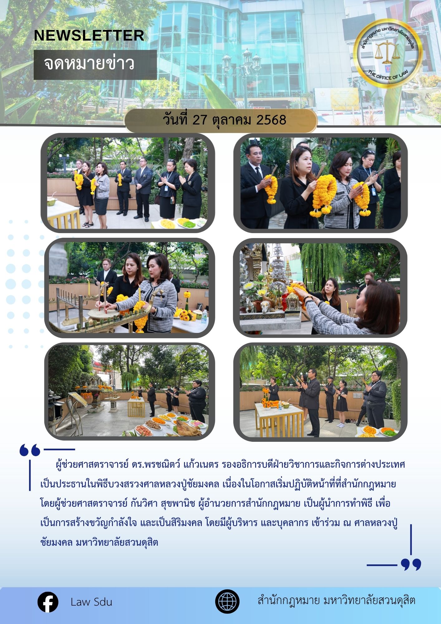 เมื่อวันที่ 27 ตุลาคม 2568 ผู้ช่วยศาสตราจารย์ ดร.พรชณิตว์ แก้วเนตร รองอธิการบดีฝ่ายวิชาการและกิจการต่างประเทศ เป็นประธานในพิธีบวงสรวงศาลหลวงปู่ชัยมงคล เนื่องในโอกาสเริ่มปฏิบัติหน้าที่ที่สำนักกฎหมาย โดยผู้ช่วยศาสตราจารย์ กันวิศา สุขพานิช ผู้อำนวยการสำนักกฎหมาย เป็นผู้นำการทำพิธี เพื่อเป็นการสร้างขวัญกำลังใจ และเป็นสิริมงคล โดยมีผู้บริหาร และบุคลากร เข้าร่วม ณ ศาลหลวงปู่ชัยมงคล มหาวิทยาลัยสวนดุสิต